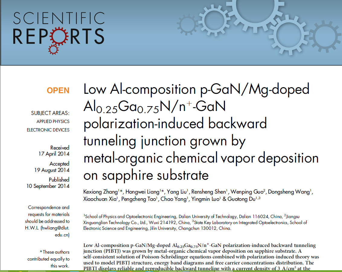 近日,大连理工大学物理与光电工程学院博士研究生张克雄与梁红伟副教授(通讯作者)为共同第一作者的以“Low Al-composition p-GaN/Mg-doped Al0.25Ga0.75N/n+-GaN polarization-induced backward tunneling junction grown by metal-organic chemical vapor deposition on sapphire substrate”为题的论文在Nature 出版集团的综合性期刊Scientific Reports上发表,该论文是张克雄同学在杜国同教授及梁红伟副教授指导下完成的。文章链接为:。