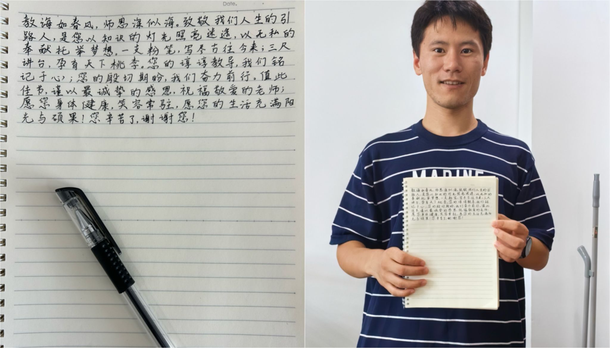 夏翎筝同学在感谢信中表示,对老师最真挚的感谢,是将谆谆教诲内化为前行的动力。作者以此信鞭策自己,以更勤奋的姿态投入学习,以更严谨的态度对待科研,以更积极的心态面对人生,努力成长为有理想、有本领、有担当的新时代青年!