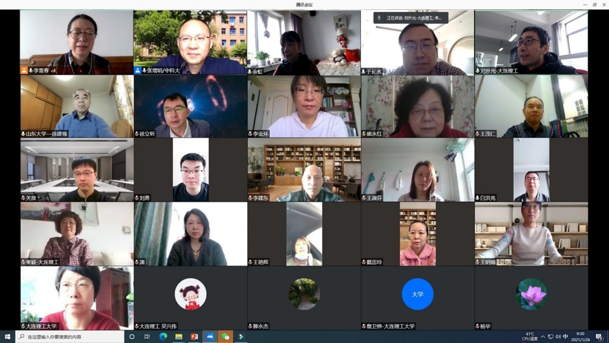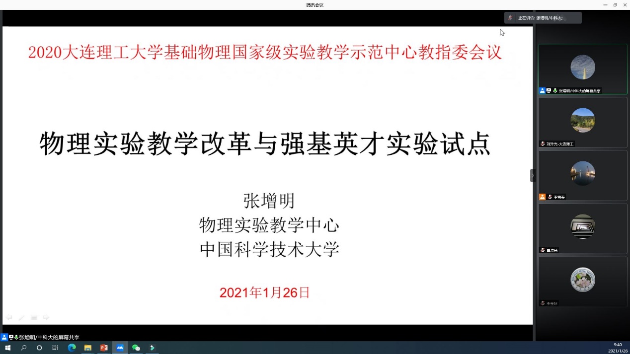 2020年1月26日,基础物理国家级实验教学示范中心(大连理工大学)教学指导委员会2020年年会通过腾讯会议的方式在线上召开。中心教学指导委员会主任、中国科技大学张增明教授、中心教学指导委员会委员华中科技大学熊永红教授、山东大学徐建强教授、东北师范大学李金环教授、大连理工大学余虹教授、大连理工大学李雪春教授以及实验中心的全体教师参加了会议。我校教务处副处长徐立昕教授、开云手机站登录入口副院长于长水教授出席会议。