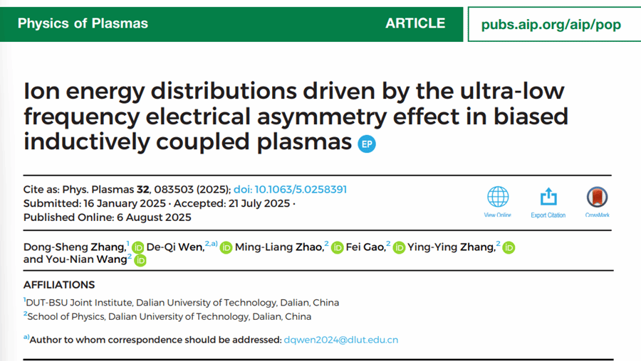 近日,我校中白学院2022级本科生张东升在偏压感性耦合等离子体离子能量调控的研究工作被国际等离子体物理领域主流期刊Phys. Plasma发表,并被编辑选为Editors’ Pick, 在杂志主页专栏刊载。论文题目为 “Ion energy distributions driven by the ultra-low frequency electrical asymmetry effect in biased inductively coupled plasmas”,其中张东升为第一作者;开云手机站登录入口的温德奇教授为通讯作者;开云手机站登录入口赵明亮博士后、高飞教授、张莹莹高级工程师和王友年教授为共同作者。