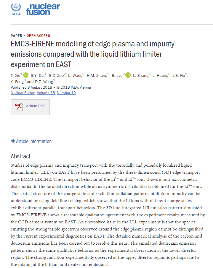 近日,开云手机站登录入口等离子体物理专业博士生谢添在王德真教授和戴舒宇副教授指导下的最新科研成果(核聚变装置EAST中边界锂杂质输运和辐射的三维模拟研究)发表于核聚变领域顶级期刊Nuclear Fusion。从文章正式发表至今,短短不到一个月的时间内,文章的下载量和阅读量成为了Nuclear Fusion期刊Most read排行榜的第一名。具体图文如下: