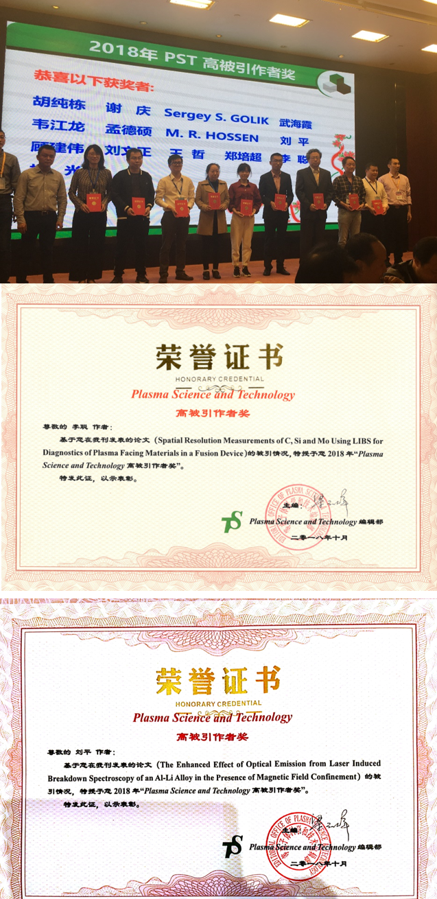 在10月12日至14日于南京召开的2018全国高电压与放电等离子体学术会议上,开云手机站登录入口丁洪斌课题组讲师李聪、博士毕业生刘平分别荣获2018年“Plasma Science and Technology高被引作者奖”,这是国内等离子体旗舰刊物《Plasma Science and Technology》首次设立该奖项,海内外共有14位作者获此奖。