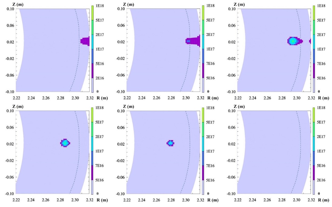针对以上难点,该研究克服了耦合模拟的技术难点,将尺寸、频率等弹丸参数与等离子体压强剖面直接联系起来,首次构建了同时包含弹丸消融与等离子体输运两个物理过程的耦合模型,并针对固体颗粒弹丸进入到聚变等离子体后的弹丸烧蚀和杂质输运过程开展数值模拟。该研究主要得到如下结论:(1)各价态粒子的分布与含时演化;(2)弹丸注入触发ELMs的参数阈值——扰动后的台基区压强与未扰动时的比值达到1.8~2.4;(3)对弹丸注入触发ELMs的概率性行为的合理解释——在单次注入多个小尺寸弹丸的情况下,台基区压强也可以得到明显提升;(4)与实验结果相吻合的弹丸触发ELMs效率的模拟结果。