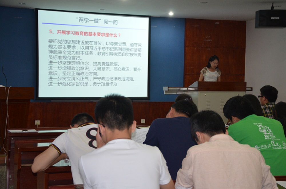 会上,韩晓宇同志首先通过“两学一做十一问”对“两学一做”常见问题进行讲解。就什么是“两学一做”、开展的范围有多大、开展学习教育的基本要求是什么及如何学习党章党规和系列讲话等十一个问题进行了详细解读。韩晓宇同志讲到,“两学一做”学习教育是面向全体党员深化党内教育的重要实践,要真正把党的思想政治建设抓在日常、严在经常。