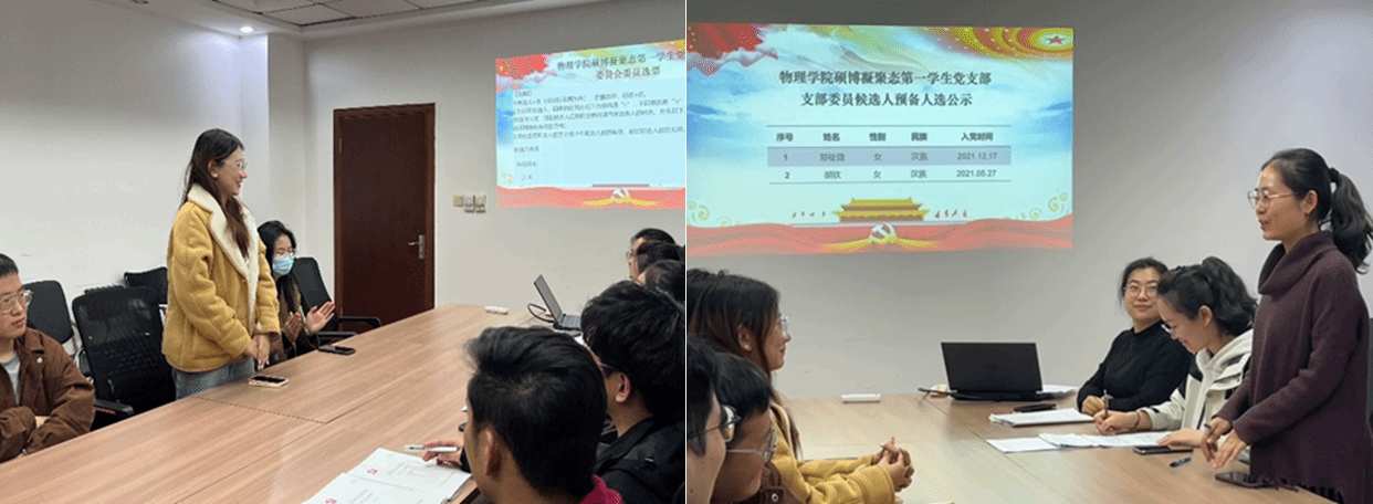 会议第二项,进行支委会换届。支部部分党员因毕业原因无法继续担任支部委员,现支部委员会空缺委员1名。本次有选举权的到会人数超过应到会人数的五分之四,符合开会要求。根据开云手机站登录入口党委批复和大会日程安排,硕博凝聚态第一学生党支部召开补选支部委员党员大会。首先由王瑞腾同志宣读补选办法,接下来推选监票人与计票人,推选结果是分别由李希娜同志与刘鹏辉同志担任监票人和计票人;随后由支部委员候选人介绍自身基本情况并进行竞选发言;最后经全体参会党员通过无记名投票,郑祉溦同志当选为硕博凝聚态第一学生党支部委员会委员。