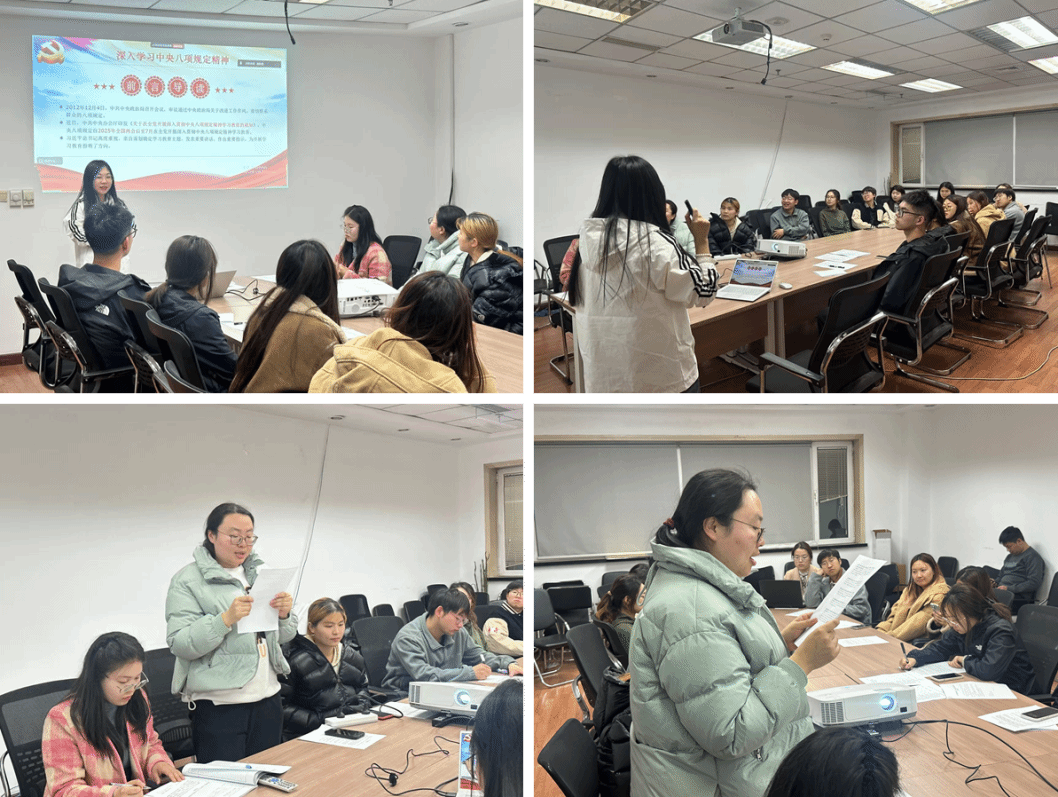 会议第一项,由党支部书记杨秋萍同志进行深入贯彻中央八项规定精神学习教育主题党课。本次党课以“深化作风建设,筑牢思想防线”为题,杨秋萍同志从“政治、历史、实践”三个层面,系统解读了中央八项规定出台的时代背景、核心内容和重大意义,并立足高校科研工作实际,重点剖析了“厉行勤俭节约”“改进调查研究”“精简会议活动”等与师生密切相关的条款。她强调:“作为科研战线的党员,我们既要严守纪律底线,更要以务实作风促进学术创新,真正将中央八项规定精神融入科研实践与日常生活。”博士后张艳雪同志通过典型案例警示,指出“思想松懈是违规的根源”,提醒师生在科研工作中保持清正廉洁。