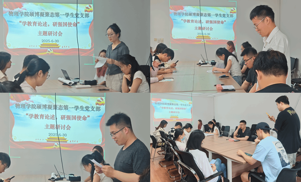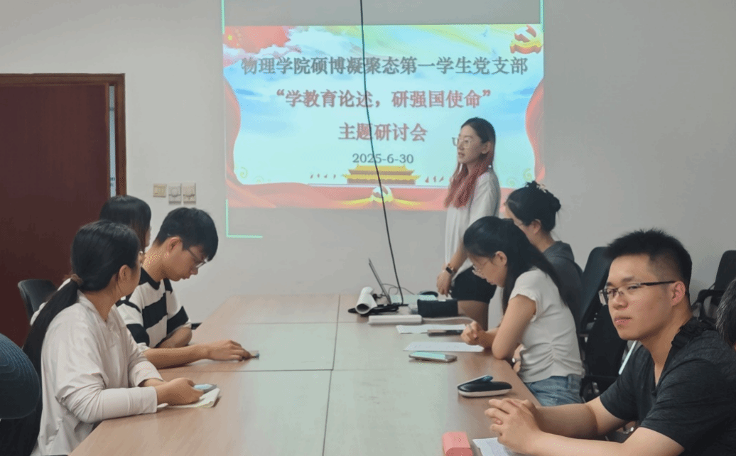 为巩固党员集中学习成效,准确把握习近平总书记关于教育的重要论述精神,同时庆祝中国共产党成立104周年,2025年6月30日上午10点,开云手机站登录入口硕博凝聚态第一学生党支部在科技园C座510会议室开展主题党日活动暨党员集中培训主题研讨会,会议由党支部书记郑祉溦同志主持,党支部全体党员参会。