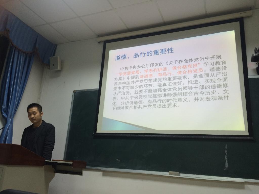 接着,朱霄龙同志从三个方面诠释了“讲道德,有品行”的时代意义,以及共产党员如何做到“讲道德,有品行”。胡艳婷同志通过“周恩来”和“杨善洲”这两名优秀共产党员的事迹,展示了一名共产党员应具备的道德品质,并倡议全体党员同志向优秀的党员模范学习。樊智慧同志和高丽红同志从不同角度出发,清晰、细致地讲解了道德的基本内涵,并分享了他们对于党员同志如何在现实生活中做到“讲道德,有品行”的建议和意见。