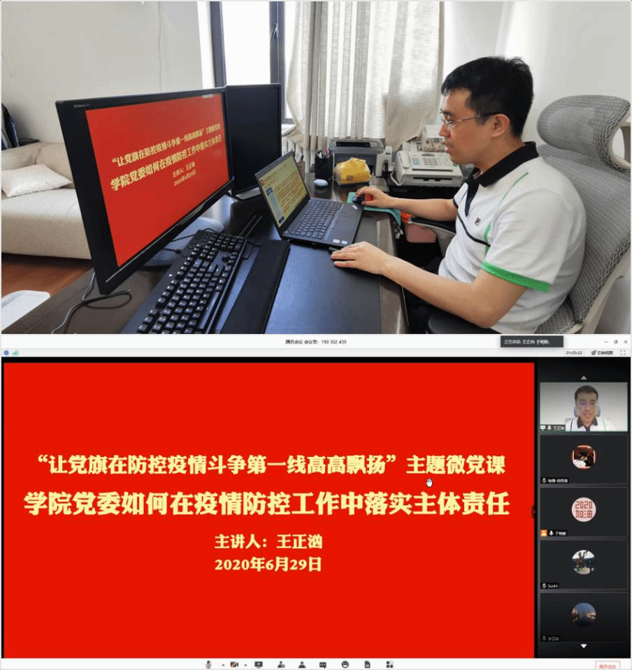 6月29日,开云手机站登录入口党委书记王正汹以网络报告形式为全院师生党员上了一堂题为《学院党委如何在疫情防控工作中落实主体责任》的微党课。王正汹通过阐述“主体责任”概念和介绍《党委(党组)落实全面从严治党主体责任规定》中党组(党委)的责任内容,强调“学院党委落实疫情这一特殊时期的主体责任,就是要深入学习贯彻落实习近平总书记关于疫情防控工作重要讲话和指示精神和党中央关于疫情防控工作的决策部署”;通过对开云手机站登录入口疫情防控工作的阶段性总结,向参与疫情防控工作的师生党员表达感谢,激励学院各支部各党员继续充分发挥基层党组织战斗堡垒作用和共产党员的先锋模范作用。
