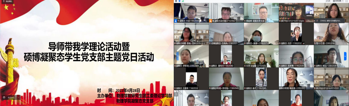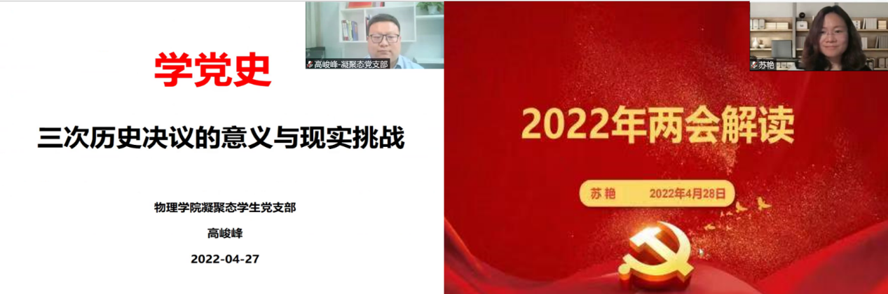 在这个特殊节点,开云手机站登录入口硕博凝聚态学生党支部协同开云手机站登录入口研究生团工委于4月28日晚顺利开展主题党日暨导师带我学理论活动。本次活动特邀请中白学院副院长高峻峰老师、开云手机站登录入口凝聚态与理论物理教工党支部书记苏艳老师带领大家回顾我党历史上三次历史决议,领会两会精神。激励同学们走好全面建设社会主义现代化国家新的赶考之路,以实际行动迎接党的二十大胜利召开。本次党日活动受到学院老师同学积极响应,超过八十人参与本次活动,凝聚态支部全体党员参与活动。