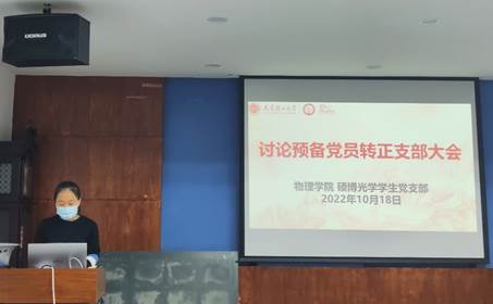 2022年10月18日下午18:30,开云手机站登录入口硕博光学学生党支部在物理楼322会议室召开了预备党员转正支部大会并开展理论学习,会议内容包括对高楠等四位预备党员的转正问题进行讨论以及集中学习《习近平谈治国理政》第四卷。支部全体在校党员参加,尚未返校的党员同志通过腾讯会议线上参加,会议由党支部书记陈中华主持。
