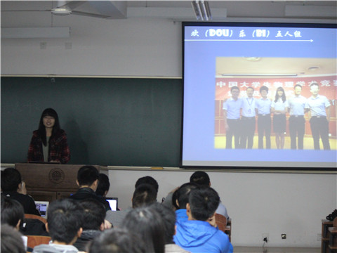 随后,去年获得国家二等奖的参赛队伍进行了比赛经验的介绍和比赛流程的模拟。首先由队员梁敬淯介绍了她们的队伍,分享了一些他们的比赛经历和比赛经验。随后,另外四名队员进行了决赛的比赛流程演示。比赛形式三支队伍一组,两支队伍进行正反方辩论,另外一组作为评论方点评,流程依次为:正方PPT展示反方提出的题目;反方向正方提问,正方回答;反方作报告,正反方辩论;评论方提问,正反方回答;评论方报告;正方总结发言。队员们各司其职,正方条理清晰的展示,正反方剑拔弩张的辩论,评论方细致风趣的点评,生动形象地为同学们再现了决赛的情景。之后,滕永杰老师对几名队员辩论时的表现进行了点评,让同学们对比赛的形式有了十分细致的了解。