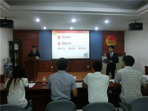 7月10日晚,物理与光电工程学院2013-2014学年度团支部建设终评大会于物理系楼322顺利进行。出席本次大会的嘉宾及评委有物理与光电工程学院团委书记佟西原老师、13级辅导员俞洲老师、学生会副主席兼团委宣传调研部部长孙雨周以及团委组织部部长崔佳琪。