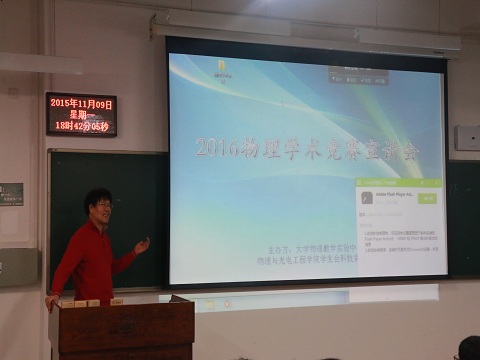 宣讲会伊始,主持人邀请姜东光老师为同学讲解比赛历史。姜老师的讲话生动形象,他重点提到了团队合作的重要性以及留心观察生活现象的意义,深奥复杂的物理原理变得具体生动。姜老师最后也对今年的参赛学员寄予厚望,希望他们能延续辉煌,再创佳绩。