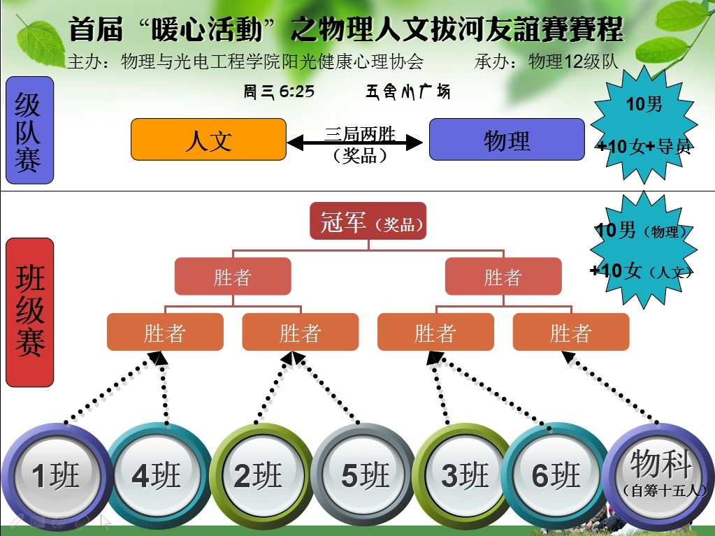 新学期伊始,为了增进物理学子与其他学院同学的互通与交流,物理与光电工程学院阳光心协“暖心”系列活动敲响战鼓,3月12号清晨6点30分,“暖心”活动之拔河友谊赛在5舍小广场。开云手机站登录入口和人文学部的全体12级同学都参加了活动,物理心协的指导老师纪丹红老师和人文2012级队的李文超辅导员老师也到场亲身参与了活动。