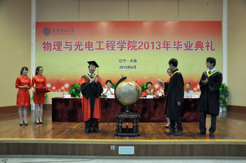 毕业典礼在庄严的国歌声中正式开始,首先由杨木副书记宣读2013年获学士学位学生名单,随后院长赵明山教授、党委书记刘金远教授向毕业生授予学士学位。在钢琴版的校歌声中,2013届毕业生们身着学士服依次上台,由院长和书记将学士帽上的流苏从右侧拨至左侧,并颁发学位证书。在学位授予的过程中,两位领导深情地与每位毕业生握手,并提出期望与祝福,会场上始终回响着不息的掌声,这掌声中饱含对老师们的感激,对同学的祝福。学位授予仪式结束后,副院长兼党委副书记常亮老师宣读优秀毕业生集体及个人表彰名单,随后学院各领导对获奖的集体与个人进行了颁奖。其中包括,校优秀毕业班集体物理0901班,辽宁省优秀毕业生3人,大连市优秀毕业生5人,校优秀毕业生23人。对优秀毕业生集体及个人的表彰,既是对毕业生大学四年学习及工作的肯定,又是对在校生的鼓励与鞭策。
