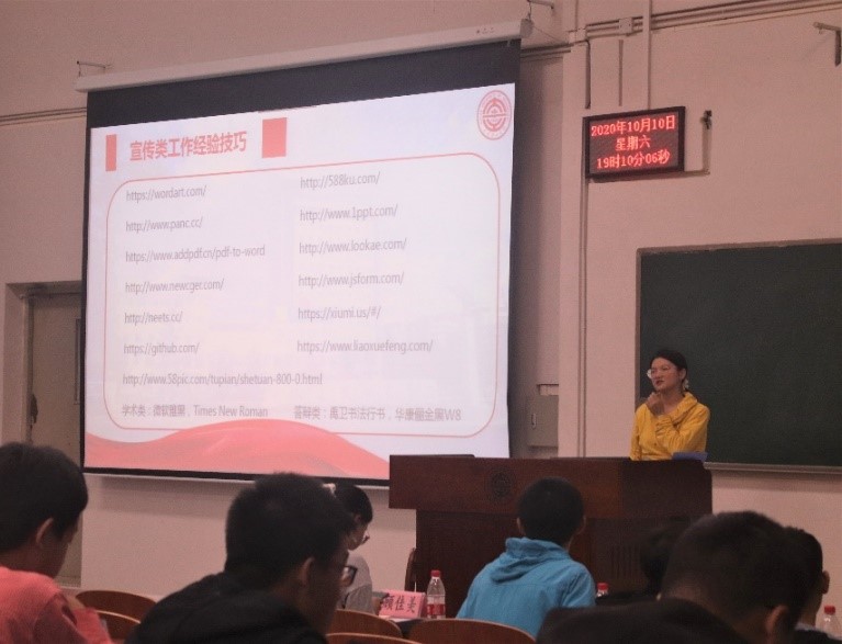 善于学生工作的温昕向同学们介绍各学生工作部门的特点,并介绍校团委、校心协的主要配置。温昕贴心地提到一些学生工作的小技巧,让新生们面对学生工作不再迷茫。她建议在大一期间可以通过做一些学生工作来锻炼自己的能力,丰富生活。