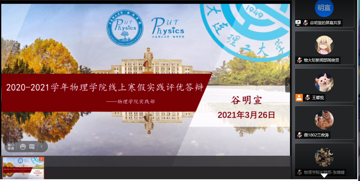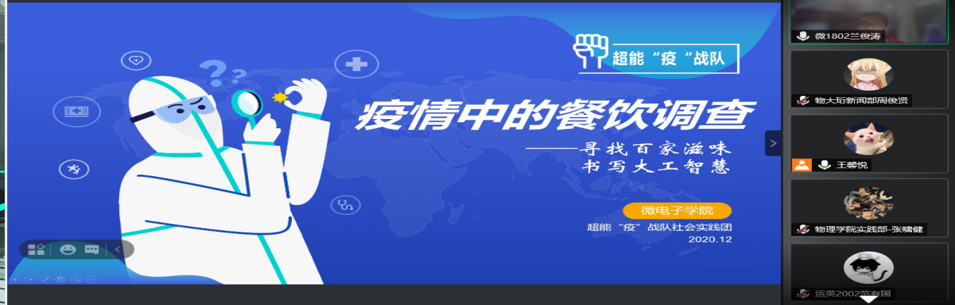 同学们所进行的寒假社会实践种类多种多样,首先进行答辩的是来自大连理工大学微电子学院的超能“疫”战队,在调查疫情方面,他们另辟蹊径,抓住了受疫情影响较大的餐饮行业,并且灵活运用了matlab,seir模型等工具进行分析,对结果及时进行反思,得到防疫方面的感悟与体会,让评委们感受到了这次实践的重要意义。接着进行答辩的两组是进行母校行宣传的实践团队,分别是来自运载学院范有国同学的团队以及机械工程学院王欣萍同学的团队。两组实践队伍都认真负责,其数据反馈与宣讲照片都真实可信,并且两支队伍都不约而同的采用了多种方式进行宣讲活动,利用微信公众号微博等自媒体设备来扩大影响力。
